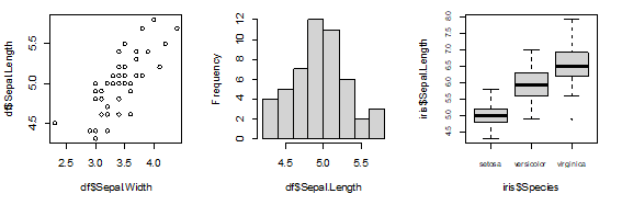 たとえば、散布図、ヒストグラム、箱ひげ図の最もシンプルなコードは以下のようになります。