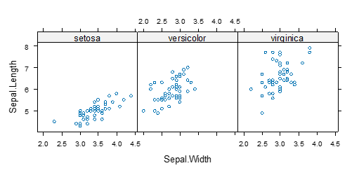 ・xyplot(y ~ x | g) :カテゴリ変数 g でグルーブ分けした散布図(下図)